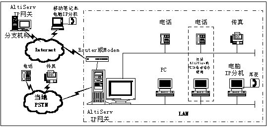 AltiServ系統(tǒng)通過(guò)IP組合成一個(gè)網(wǎng)絡(luò)。同時(shí),該功能允許用戶(hù)通過(guò)IP外線(xiàn)撥打一個(gè)遠(yuǎn)端的AltiServ系統(tǒng)