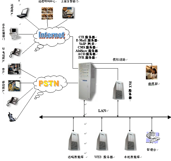 另一方面,CTI(計(jì)算機(jī)語(yǔ)音集成)技術(shù)的出現(xiàn),實(shí)現(xiàn)了通信技術(shù)與計(jì)算機(jī)技術(shù)的結(jié)合,利用計(jì)算機(jī)技術(shù)可以大大增加服務(wù)的信息量、提高速度、拓展新型客戶服務(wù)業(yè)務(wù)。因此為了滿足計(jì)算機(jī)、信息技術(shù)的演進(jìn)和客戶服務(wù)的需求,利用CTI技術(shù),面向用戶,提供綜合服務(wù)的客戶服務(wù)中心系統(tǒng)應(yīng)運(yùn)而生。對(duì)于用戶,客戶服務(wù)中心系統(tǒng)能夠提供更優(yōu)質(zhì)的用戶服務(wù),用戶能從服務(wù)方得到最快的響應(yīng),能夠得到24小時(shí)的持續(xù)服務(wù),能夠同時(shí)得到語(yǔ)音、圖象、數(shù)據(jù)多方面的信息支持。對(duì)于企業(yè),客戶服務(wù)中心在提高客戶服務(wù)質(zhì)量的同時(shí),還能有效的控制成本、增加收入,樹(shù)立專業(yè)化的企業(yè)形象,建立完善的客戶服務(wù)資料庫(kù)。