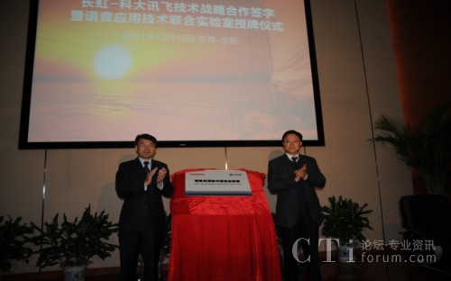 CTI論壇(ctiforum)12月14消息(記者 潘婷婷): 12月12日,科大訊飛與長(zhǎng)虹集團(tuán)戰(zhàn)略合作簽約暨共建聯(lián)合實(shí)驗(yàn)室揭牌儀式在科大訊飛語音產(chǎn)業(yè)基地研發(fā)大樓隆重舉行。根據(jù)合作框架協(xié)議,雙方將在戰(zhàn)略聯(lián)盟的基礎(chǔ)上,以共建聯(lián)合實(shí)驗(yàn)室為主要載體,旨在依托各自行業(yè)領(lǐng)域的長(zhǎng)期積淀優(yōu)勢(shì)、強(qiáng)強(qiáng)聯(lián)合,達(dá)成戰(zhàn)略互信,加強(qiáng)緊密合作,積極推動(dòng)“語音核心引擎+智能終端平臺(tái)” 的特色應(yīng)用模式,深入拓展智能語音科技在智能電視等終端產(chǎn)品市場(chǎng)的應(yīng)用范圍,合力開創(chuàng)智能語音終端創(chuàng)新應(yīng)用市場(chǎng)空間。