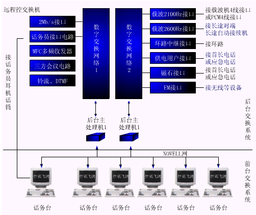 "前臺(tái)座席系統(tǒng)"包括班長(zhǎng)臺(tái)和話務(wù)臺(tái),均采用微機(jī),運(yùn)用先進(jìn)的計(jì)算機(jī)聯(lián)網(wǎng)技術(shù),將它們通過網(wǎng)絡(luò)與"后臺(tái)交換系統(tǒng)"相連。班長(zhǎng)臺(tái)和所有話務(wù)臺(tái)的硬件連接完全相同,任何一臺(tái)損壞,不影響其它話務(wù)臺(tái)的使用,即不存在關(guān)鍵接點(diǎn),提高了系統(tǒng)的安全可靠性。全漢化圖形界面,交互式人機(jī)操作方式,簡(jiǎn)單明了,易于掌握。所有話務(wù)臺(tái)均為集記錄、查號(hào)、市話轉(zhuǎn)接、長(zhǎng)話轉(zhuǎn)接為一體的綜合型人工話務(wù)臺(tái),所有功能由數(shù)據(jù)定義,可分可合,可方便的進(jìn)行設(shè)置,也可臨時(shí)并席,為系統(tǒng)高質(zhì)量的服務(wù)提供了可靠的基礎(chǔ)。所有話票均在計(jì)算機(jī)上填寫,由網(wǎng)絡(luò)自動(dòng)傳送,不再使用紙?jiān)捚保膊恍枞斯し职l(fā)話票,極大的減輕了勞動(dòng)強(qiáng)度,提高了辦事效率。為了減小系統(tǒng)規(guī)模,我們將查詢、計(jì)費(fèi)、統(tǒng)計(jì)、管理、維護(hù)五種功能融合為一體,統(tǒng)一成為多功能的班長(zhǎng)臺(tái),其功能亦可分可合,視用戶需求而定。