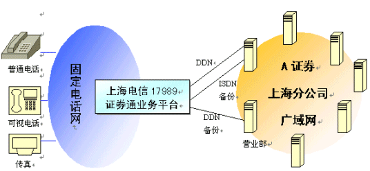 "17989證券通"服務(wù)是上海電信和黎明網(wǎng)絡(luò)共同向上海地區(qū)證券公司提供的通道外包式綜合服務(wù)。與電信提供的傳統(tǒng)的固定通道收費(fèi)服務(wù)不同,"17989證券通"服務(wù)的顯著特色是"集中交易,按需服務(wù)"。該項(xiàng)服務(wù)自推出以來,就以其低成本、集中式電話交易和大量增值服務(wù)贏得了許多證券公司的普遍關(guān)注。下面是某大型綜合性證券公司采用"17989證券通"服務(wù)的案例剖析。
