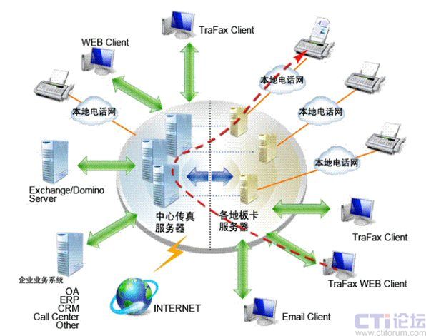 Server板卡服務(wù)器都將通過Internet或企業(yè)網(wǎng)絡(luò)而相互連接起來,協(xié)同工作, 共同分擔工作負荷, 共享資源和傳真信道。這樣傳真也是被傳遞到離目的地最近的板卡服務(wù)器后才發(fā)送出去,從而將國際,國內(nèi)傳真費用減少為本地傳真費用。
