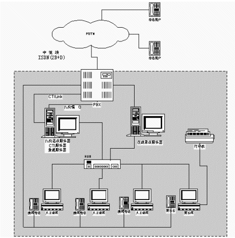 一臺Siemens Hipath交換機:接入16條(2B+D)ISDN中繼線,設(shè)置人工座席分機,為CTI、IVR語音服務(wù)器提供8路IVR端口。