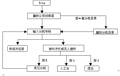 這種情況下自動總機服務(wù)扮演了如同人工總機的角色,提示來話方鍵入分機號碼并將其轉(zhuǎn)接到指定的分機去。如果轉(zhuǎn)接不成功(被叫方占線,無人接聽等)系統(tǒng)提示主叫轉(zhuǎn)到其它分機或轉(zhuǎn)人工臺。