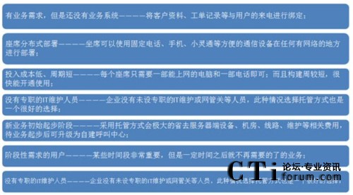 基于云計(jì)算(400+Saas)的ToneThink強(qiáng)訊托管型呼叫中心采用世界最先進(jìn)的呼叫中心核心技術(shù),企業(yè)無(wú)需投入任何軟件、硬件,即可根據(jù)業(yè)務(wù)需求立刻擁有一套自己的呼叫中心系統(tǒng),獲得呼入式、呼出式營(yíng)銷服務(wù)帶來的超值回報(bào)。那么什么情況下您適合選用托管型的呼叫中心呢?