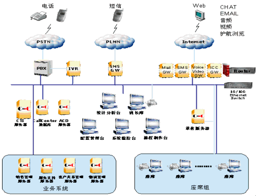 。。系統(tǒng)采用PBX提供完備的呼叫控制功能,能夠滿足呼叫中心電話應用的需要,實現(xiàn)呼入、呼出、內(nèi)部通話、保持、接回、咨詢、轉接、會議等各種電話控制功能;同時,PBX具有CTILink接口,可實現(xiàn)與計算機系統(tǒng)的連接。