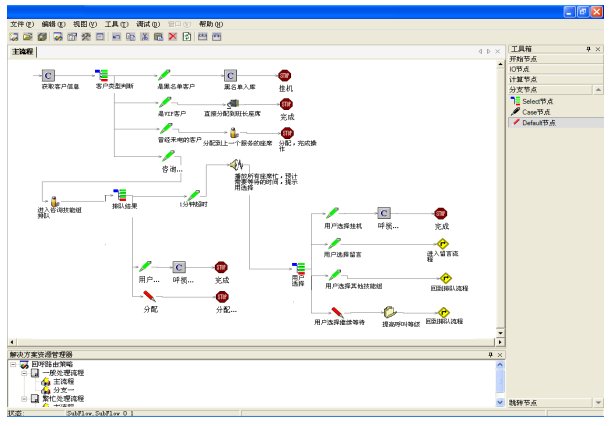 Hi-Link提供圖形化、流程式的ACD路由策略定制工具,實現(xiàn)ACD流程的靈活定義和配置。該工具不僅僅實現(xiàn)了流程邏輯、資源管理和數(shù)據(jù)庫訪問的可配置,而且可以在流程中內嵌VBScript處理邏輯,進而實現(xiàn)更加強大的路由管理能力。如圖所示: