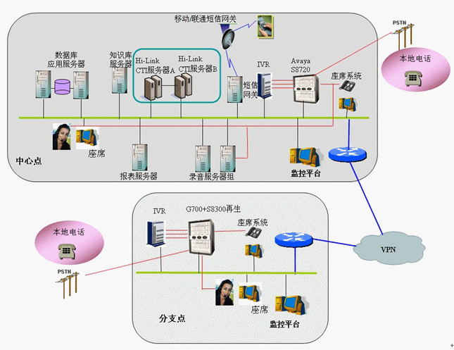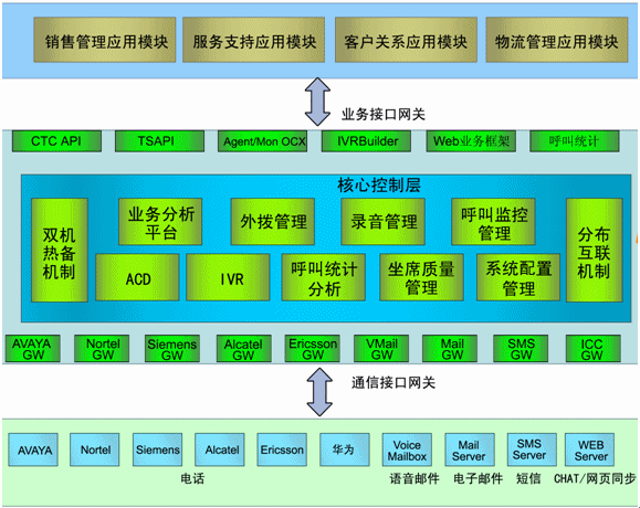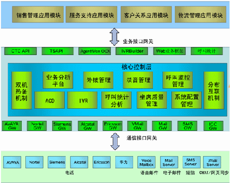 - 核心控制層:ACD、IVR、呼叫統(tǒng)計分析、坐席質(zhì)量管理、系統(tǒng)配置管理、業(yè)務(wù)分析平臺、預(yù)測外撥管理、工作流平臺、坐席資源管理、分布互連機(jī)制、雙機(jī)熱備機(jī)制;