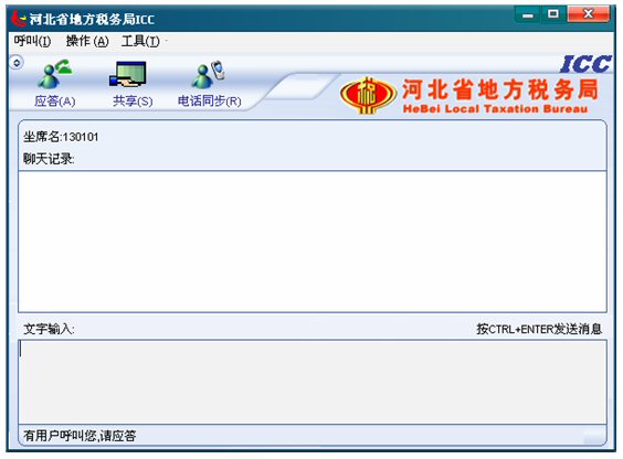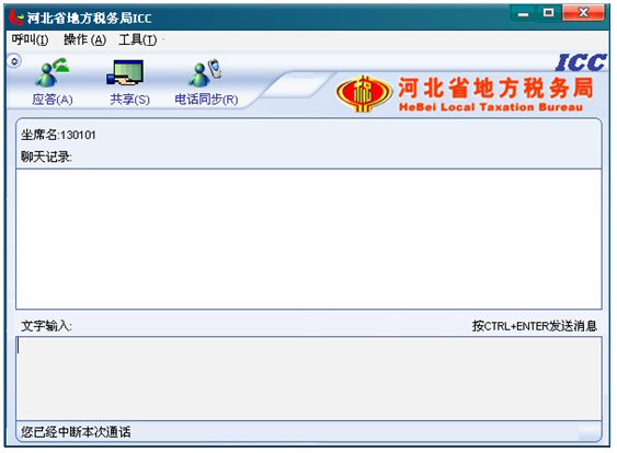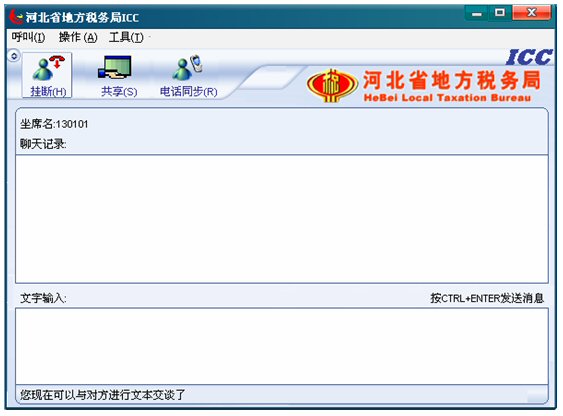 5. 點(diǎn)擊應(yīng)答按鈕后,應(yīng)答按鈕變?yōu)閽鞌喟粹o,并且左下角的狀態(tài)欄文字提示首先變?yōu)椤澳F(xiàn)在可以與對(duì)方進(jìn)行文本交談了”,從現(xiàn)在開(kāi)始到坐席掛斷呼叫期間,坐席就可以和納稅人進(jìn)行文本交談了。