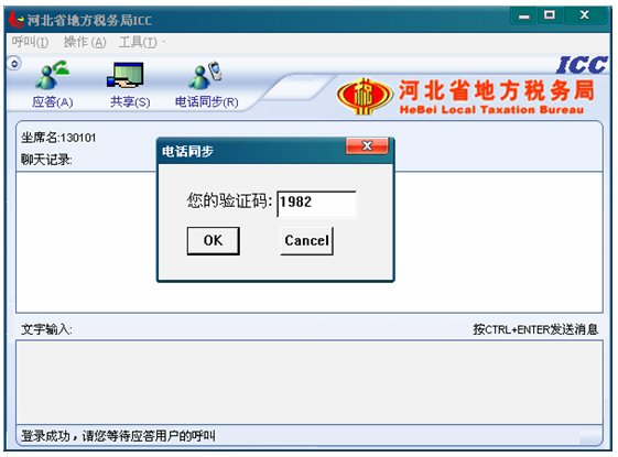 坐席只需通過(guò)電話將此框中的驗(yàn)證碼(比如圖例中的1982驗(yàn)證碼)告訴和坐席通話的納稅人。然后點(diǎn)擊OK按鈕。納稅人端得到坐席告訴他的驗(yàn)證碼后,納稅人端也有個(gè)電話同步按鈕,納稅人點(diǎn)擊并輸入坐席告訴他的驗(yàn)證碼后,坐席就可以看到有呼叫進(jìn)來(lái)。此呼叫就是正和坐席通話納稅人的ICC呼叫。坐席點(diǎn)擊應(yīng)答后就可以和此納稅人ICC