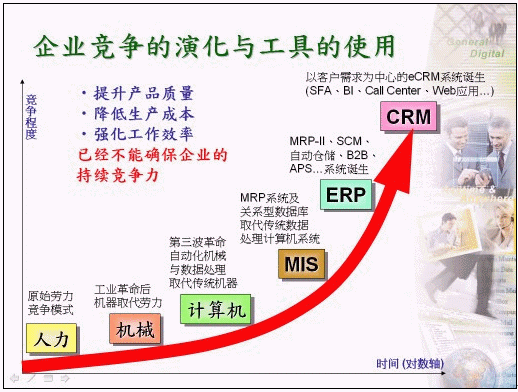 如此龐大的系統(tǒng)以信息技術(shù)角度來(lái)看,確實(shí)已經(jīng)涵蓋了企業(yè)日常營(yíng)運(yùn)作業(yè)的6、7成以上,因此,很多企業(yè)的主管甚或MIS主管認(rèn)為建置了ERP系統(tǒng)之后其實(shí)就已經(jīng)作好企業(yè)e化的工作了,其實(shí)仔細(xì)思考之后您會(huì)發(fā)覺(jué)ERP系統(tǒng)還是有其功能限制之處,以業(yè)務(wù)單位之銷售工作推展為例,所能享受到的e化成果真是少之又少,許多業(yè)務(wù)人員平日最常運(yùn)用到ERP系統(tǒng)大都為訂單管理部份,只有少部份的業(yè)務(wù)人員同時(shí)會(huì)運(yùn)用到ERP系統(tǒng)中之報(bào)價(jià)功能,尤其ERP系統(tǒng)對(duì)業(yè)務(wù)人員在開發(fā)潛在客戶或作好案例管理方面之應(yīng)用更是幫助有限。