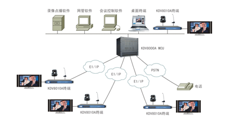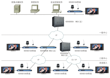 作為一款電信級(jí)MCU,KDV8000A具有強(qiáng)大的接入能力和豐富的功能模塊,可靈活應(yīng)用于各類(lèi)視頻會(huì)議系統(tǒng)。下圖1是KDV8000A在節(jié)點(diǎn)數(shù)量多、網(wǎng)絡(luò)環(huán)境復(fù)雜的大型視頻會(huì)議系統(tǒng)中的典型應(yīng)用,下圖2是KDV8000A在衛(wèi)星視頻會(huì)議系統(tǒng)中的應(yīng)用,下圖3是KDV8000A在多級(jí)級(jí)聯(lián)系統(tǒng)中的應(yīng)用。