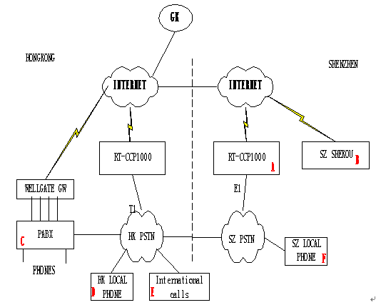 - A點是深圳福田的office,B點是深圳蛇口的辦事處,C點是香港總部的office,D點香港本地電話用戶,E點來自國際的呼叫,F(xiàn)點是深圳本地的電話用戶。