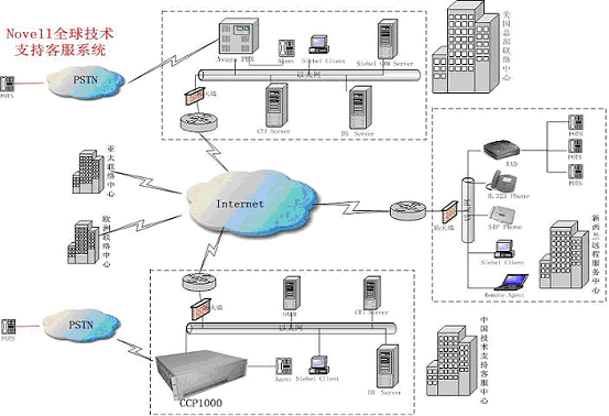 Novell中國(guó)技術(shù)支持中心采用融天科技的RT-CCP1000作為呼叫處理平臺(tái),業(yè)務(wù)處理通過(guò)Internet用瀏覽器的方式使用美國(guó)現(xiàn)有的Siebel CRM業(yè)務(wù)系統(tǒng),作為Novell全球客戶(hù)服務(wù)支撐體系的一個(gè)分支,響應(yīng)來(lái)自全球的客戶(hù)服務(wù)。基于IP網(wǎng)絡(luò),系統(tǒng)設(shè)立了遠(yuǎn)端座席,為不同地區(qū)的用戶(hù)提供本地化、無(wú)差異化的服務(wù)。