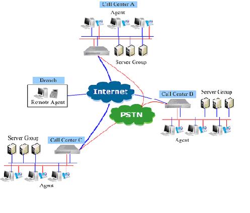 圖析:上圖中,整個分布式呼叫中心系統(tǒng)由三個獨立呼叫中心以及遠(yuǎn)端座席構(gòu)成,彼此都通過Internet或者其它網(wǎng)絡(luò)互連。三個呼叫中心每個都是獨立完整的呼叫中心,在任何時候,都可以獨立工作,遠(yuǎn)程座席則要注冊到某一呼叫中心上。