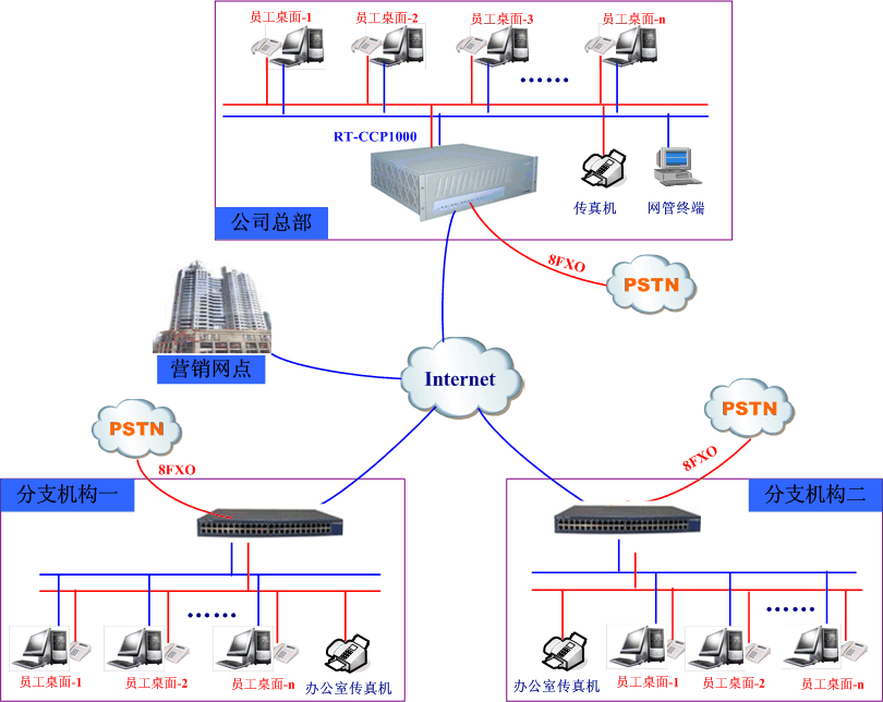 項(xiàng)目建設(shè)中,既要充分考慮到后續(xù)隨時(shí)隨地分支機(jī)構(gòu)的加入,又要考慮中繼線路的擴(kuò)容等因素。融天科技RT-CCP1000融和通信一體化平臺(tái),既能靈活的實(shí)現(xiàn)企業(yè)異地組網(wǎng)方式,又能方便的位企業(yè)定制各種個(gè)性化的增值業(yè)務(wù),如自動(dòng)值機(jī)、語(yǔ)音郵箱、電話會(huì)議、個(gè)人傳真等個(gè)性化業(yè)務(wù),不用增加任何硬件設(shè)備的情況下還能輕松的實(shí)現(xiàn)呼叫中心功能、與用戶方已有的ERP、CRM系統(tǒng)對(duì)接功能等,方案組網(wǎng)如下: