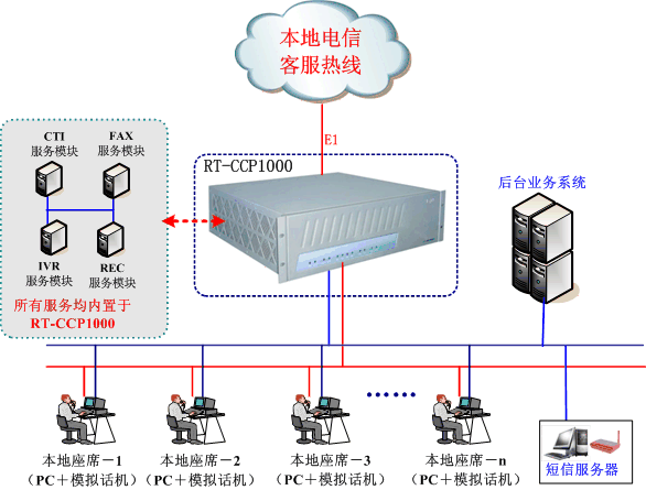 系統(tǒng)架構(gòu)簡單,CIT服務(wù)模塊、傳真服務(wù)模塊、IVR服務(wù)模塊、錄音服務(wù)模塊都內(nèi)置在RT-CCP1000內(nèi),從電信運(yùn)營商接入1條數(shù)字中繼E1到RT-CCP1000,RT-CC1000提供20個人工座席10路VIR,同時支持語音、留言、傳真、短信、郵件方式,為申銀萬國客戶提供全方位的服務(wù)模式;提供業(yè)務(wù)系統(tǒng)接口與申銀萬國后臺業(yè)務(wù)系統(tǒng)無縫整合,實(shí)現(xiàn)呼叫中心系統(tǒng)與業(yè)務(wù)系統(tǒng)的緊密結(jié)合;為申銀萬國量身定制多款個性化的工單。維護(hù)界面采用全中文WEB方式,支持遠(yuǎn)程維護(hù),同時也支持遠(yuǎn)程座席方式,為后續(xù)公司的發(fā)展打下了堅(jiān)實(shí)的基礎(chǔ)。