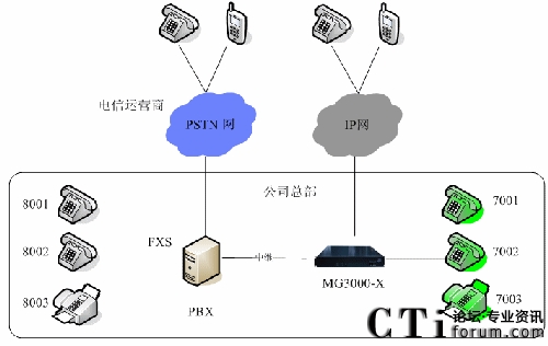 在公司總部增加一臺IPPBX(MG3000-X),通過中繼線與原有的PBX系統(tǒng)互聯,在IPPBX上開通分機(7XXX), 新增員工的分機: