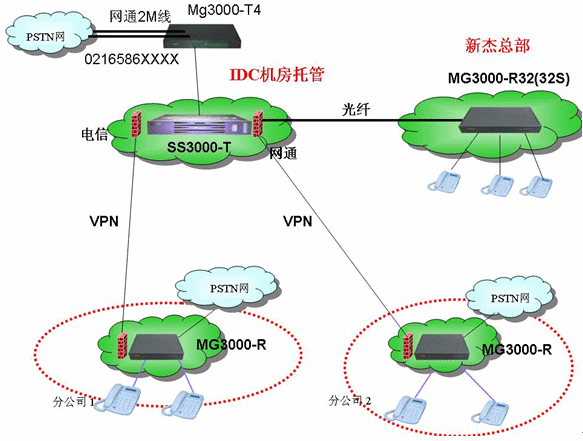 - 各地全部采用MG3000-R,通過VPN注冊到軟交換平臺上,S口接普通電話,O口接原來的模擬線,整個系統(tǒng)通過各地-R的O口實(shí)現(xiàn)長途落地的功能。