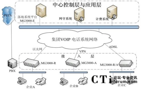 各單位利用自己的網(wǎng)絡(luò)組建集團(tuán)VOIP語音網(wǎng)絡(luò)。無論是在國內(nèi)的各單位總部及其分支還是海外的企業(yè)分支,不管是通過專網(wǎng)還是ADSL等連入集團(tuán)管理平臺(tái),都可以利用這個(gè)管理平臺(tái)傳輸語音業(yè)務(wù),總部和各分支機(jī)構(gòu)可以通過不同的網(wǎng)絡(luò)接入手段。