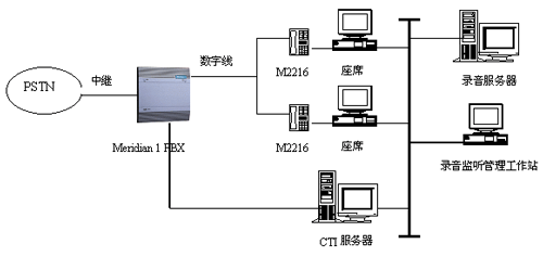 使用Meridian 2216 ACD數(shù)字話機(jī)上的錄音端口,直接接入模擬語(yǔ)音卡,進(jìn)行錄音監(jiān)控。其物理結(jié)構(gòu)如下所示: