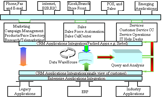 傳統(tǒng)的數(shù)據(jù)庫及中間件軟件廠商,都能提供一些“point solution”(指基于某一單獨(dú)技術(shù)領(lǐng)域),例如,單獨(dú)的客戶服務(wù)CallCenter方案,數(shù)據(jù)倉庫/商業(yè)智能BI解決方案。Compaq向客戶提供的是完整的CRM方案套件,其技術(shù)組成主要包括前端的基于多種接觸媒體(phone,fax,email,web)CallCenter;核心部分的Sales Force Automation,Marketing Automation,Service Operation;以及后端的DataWareHouse/BI,ERP及原有集成應(yīng)用系統(tǒng)(Legacy Application)的集成等部分。通過下圖我們將詳細(xì)描述康柏的整體CRM方案框架及其解決方案: