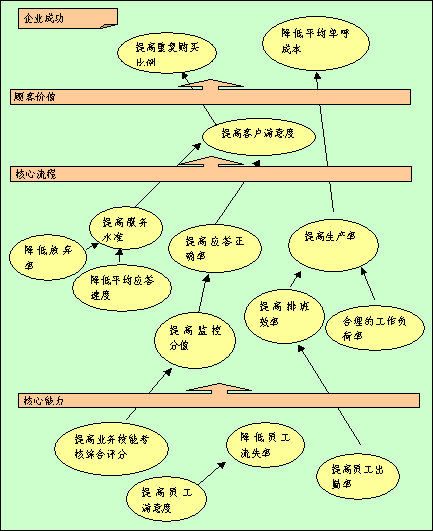 全程全網(wǎng)考核策略目標因果關系圖是"平衡計分卡"應用的重要環(huán)節(jié),在此要特別強調(diào)?因為它是將根據(jù)公司遠景規(guī)劃以及使命確定的四個考核維度轉(zhuǎn)化為全程全網(wǎng)考核系統(tǒng)進入實際操作階段之關鍵步驟。在平衡記分卡的設計過程中,它起著承前啟后的作用,在構(gòu)建呼叫中心全程全網(wǎng)考核系統(tǒng)中全程全網(wǎng)考核策略目標因果關系圖的突破性銜接功能-以其邏輯性的架構(gòu)來界定和描述實現(xiàn)全面績效考核的策略方案。將公司成功、客戶價值、核心流程和呼叫中心核心能力之間的關聯(lián)清晰地呈現(xiàn),并將企業(yè)的策略與其績效衡量系統(tǒng)相銜接。