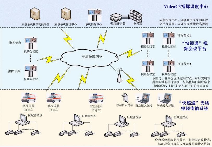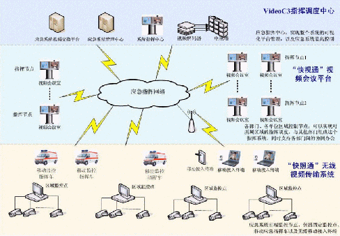 C3I視頻應(yīng)急指揮協(xié)同系統(tǒng)在政府IP網(wǎng)絡(luò)中處于城市的神經(jīng)中樞。它將政府各個部門、單位聯(lián)系成為一個整體。在C3I視頻應(yīng)急指揮協(xié)同系統(tǒng)的前端,由"快照通"無線視頻傳輸系統(tǒng)對政府所屬各個單位進(jìn)行實時監(jiān)控,時刻掌握現(xiàn)場動態(tài),該部分支持固定點(diǎn)監(jiān)控,也支持移動指揮點(diǎn)和無線移動接入終端,保證了前方工作的靈活、機(jī)動性;在系統(tǒng)的指揮中心部分,由VideoC3指揮調(diào)度中心來支持,它一方面需要對前端的監(jiān)控信息進(jìn)行控制,同時,要對整個政府進(jìn)行綜合管理調(diào)度,在發(fā)生突發(fā)狀態(tài)的時刻,現(xiàn)場前端"快照通"捕獲的相應(yīng)信息通過C3I系統(tǒng)平臺,迅速傳遞至指揮中心部分,政府管理人員通過VideoC3指揮調(diào)度中心對前端進(jìn)行遠(yuǎn)程指揮,在第一時間緊急處理現(xiàn)場突發(fā)事件;在整個C3I系統(tǒng)中,政府各個部門、單位之間通過"快視通"視頻會議平臺進(jìn)行辦公交流,支持各部門間的協(xié)同辦公,同時,也可以通過其實現(xiàn)對所屬區(qū)域的指揮調(diào)度。