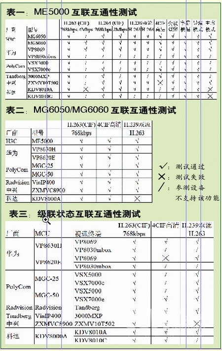 眼見為實(shí),為了驗(yàn)證H3C視訊產(chǎn)品的互聯(lián)互通性,我們對(duì)其進(jìn)行了實(shí)際測(cè)試;ヂ(lián)互通性屬應(yīng)用級(jí)特性,測(cè)試起來并不困難,但有些煩瑣。由于視訊系統(tǒng)核心組件通常包括MCU和視訊終端兩類設(shè)備,兼容性互有交叉,因此我們將測(cè)試分成3組進(jìn)行。參與測(cè)試的設(shè)備除H3C的MCU(多點(diǎn)控制單元)ME5000和視訊終端MG6050/MG6060外,還包括其它5個(gè)廠商的7款MCU和8款視訊終端。
