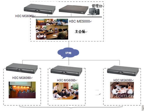 在主會場,分會場的會議室配備H3C高清視訊終端MG6060。H3C MG6060終端支持H.263、H.264等視頻編解碼協(xié)議,并采用了專有的視頻前、后處理技術,使得圖像質量大大提升,在周圍環(huán)境光照較差或者會場顏色搭配不甚和諧的情況下,仍舊能夠得到清晰、自然的圖像。視頻功能主要特色功能包括動態(tài)4CIF高清圖像、H.239雙視頻流傳送、畫中畫(PIP)、雙屏顯示、分屏顯示、VGA輸入、VGA輸出、桌面?zhèn)魉、圖像屏蔽、圖像參數(shù)調整等。有關H3C