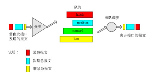 在報(bào)文到達(dá)路由設(shè)備接口后首先對報(bào)文進(jìn)行分類,然后按照報(bào)文所屬的類別讓報(bào)文進(jìn)入所屬隊(duì)列的尾部,在報(bào)文發(fā)送時(shí)按照優(yōu)先級總是在所有優(yōu)先級較高的隊(duì)列中的報(bào)文發(fā)送完畢后再發(fā)送低優(yōu)先級隊(duì)列中的報(bào)文,這樣在每次發(fā)送報(bào)文時(shí)總是將優(yōu)先級高的報(bào)文先發(fā)出去,保證了屬于較高優(yōu)先級隊(duì)列的報(bào)文有較低的時(shí)延與丟失率。