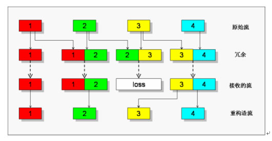 當(dāng)?shù)?個(gè)包在傳輸過程中丟失時(shí),由于包“3”被冗余編碼到第4個(gè)傳輸包中,在對端接收到碼流后還可以正常重構(gòu)出包“3”。