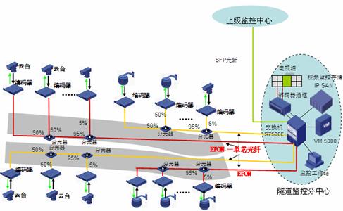 道路沿線監(jiān)控:采用EPON組網(wǎng),路況監(jiān)控球機(jī)接入前端編碼器,多個(gè)編碼器通過一根EPON光纖接入到中心交換機(jī)上,布線方便節(jié)省光纖資源。編碼器內(nèi)置交換機(jī)功能可以接入IP報(bào)警電話方便公路報(bào)警。還可以將支持IP接口的可變信號(hào)板和氣象站直接接入編碼器交換機(jī)端口,實(shí)現(xiàn)一網(wǎng)多用,降低整體網(wǎng)絡(luò)成本。