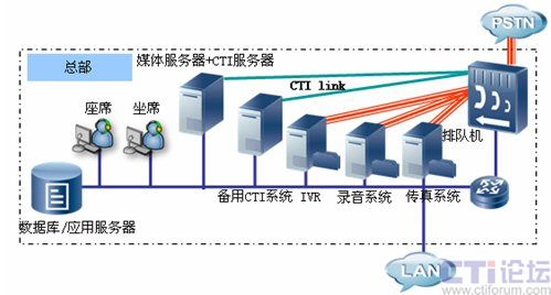 北京為總部中心,將部署CTI服務(wù)器、IVR服務(wù)器、錄音系統(tǒng)、傳真系統(tǒng)、文件服務(wù)器及相關(guān)業(yè)務(wù)數(shù)據(jù)庫服務(wù)器,為各個營業(yè)網(wǎng)點提供業(yè)務(wù)支撐?偛繉φ麄網(wǎng)絡(luò)進行管理,包括平臺配置、業(yè)務(wù)管理、數(shù)據(jù)管理、人員調(diào)度等。在總部CTI系統(tǒng)我們采用主備模式,確保了在出現(xiàn)網(wǎng)絡(luò)故障主CTI系統(tǒng)無法提供服務(wù)情況下,備用CTI系統(tǒng)將接替主CTI系統(tǒng)工作,確保了整個系統(tǒng)的正常工作。硬件平臺方面,UAP我們采用了雙主控板雙電源供電工作模式,這對系統(tǒng)長期穩(wěn)定工作提供了保障。總部同時也部署北京農(nóng)村商業(yè)銀行300個坐席人員,這些坐席人員可以按照業(yè)務(wù)進行區(qū)分,大部分坐席精通一般的業(yè)務(wù),為普通客戶提供優(yōu)質(zhì)服務(wù),少部分坐席(專業(yè)坐席)人員為高價值客戶提供高級的專業(yè)的優(yōu)質(zhì)服務(wù),在普通坐席比較忙時,專業(yè)坐席可以為普通用戶提供服務(wù),坐席中,還有極少部分可以充當(dāng)坐席管理員角色,他們也可以監(jiān)控各個分中心坐席服務(wù)的質(zhì)量,對有問題服務(wù)可以實現(xiàn)監(jiān)聽、監(jiān)察、和強拆功能,及時的保證服務(wù)質(zhì)量,維護了企業(yè)形象。