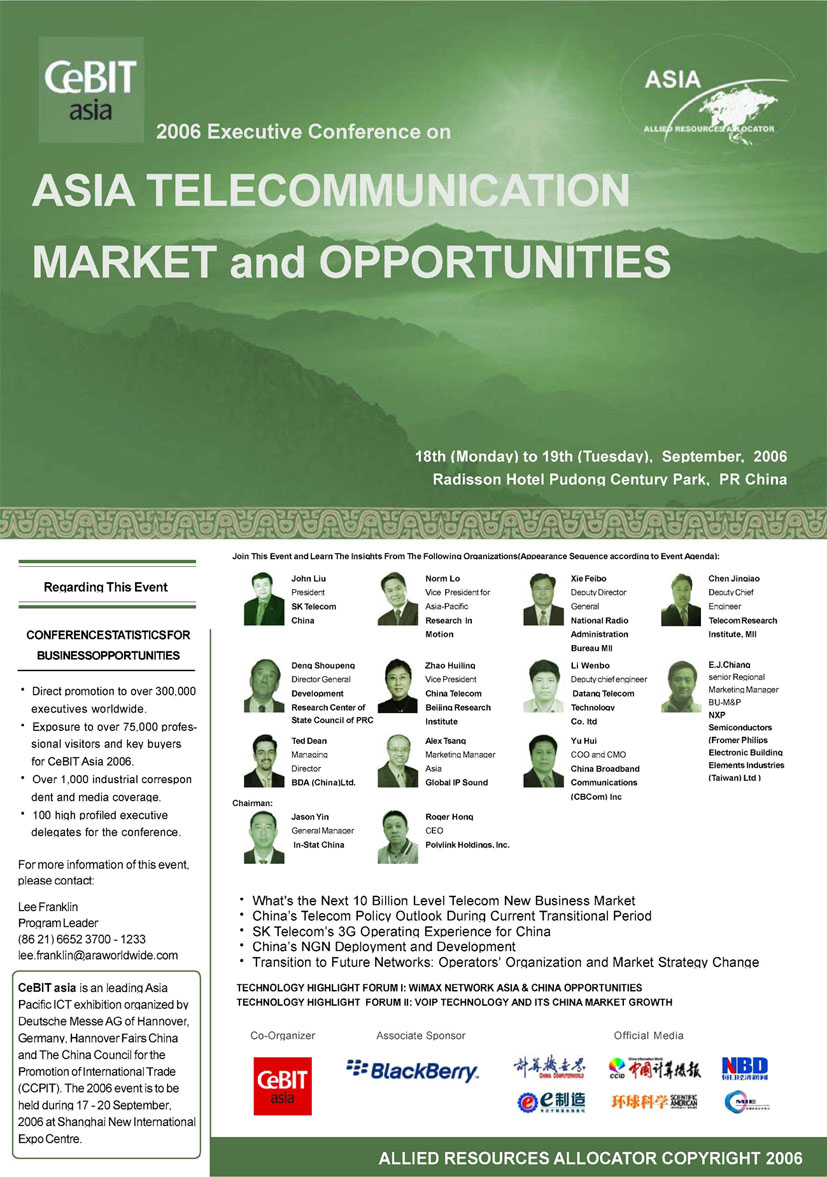 2006亞洲信息及通信技術(shù)展覽會(huì),即亞洲CeBIT展將于今年9月17日至20日在上海新國際博覽中心召開。由中國國際貿(mào)促會(huì)電子信息行業(yè)分會(huì)與德國漢諾威展覽公司聯(lián)合主辦的這一展會(huì),近300家國內(nèi)外廠商參展,將分為數(shù)字設(shè)備及系統(tǒng)、商務(wù)應(yīng)用、通信三大展區(qū),多方位展現(xiàn)ICT行業(yè)的最新趨勢(shì),并成為業(yè)內(nèi)廠商的專業(yè)貿(mào)易平臺(tái)。本次CeBIT展會(huì)期間(9月18、19日兩天),將在浦東證大麗笙酒店召開“2006亞洲通信及信息市場(chǎng)管理層論壇”。包括中國國家信息產(chǎn)業(yè)部、中國電信、韓國SK電訊、BDA中國等多家政府機(jī)關(guān)、運(yùn)營商、制造商將參加本次論壇,并做重要發(fā)言。