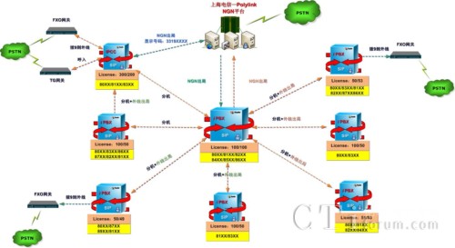 2.呼入從Polylink提供的VoIP語音服務(wù)或是FXO口網(wǎng)關(guān)呼入,呼出從Polylink-NGN平臺呼出。