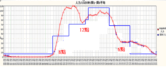 大家看到圖一中紅色的線,就是一天里面電話進(jìn)來的數(shù)量,藍(lán)色的線是安排的人力。可以清楚看到:早上8點一開始,電話就一直進(jìn)來;中午來電的客戶開始去吃飯,電話就開始下滑;然后等到客戶吃完中飯,電話又開始進(jìn)來,下午又出現(xiàn)另外一個高峰;一直到5點以后又開始下滑,6點以后電話相對就少很多。