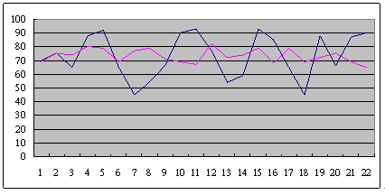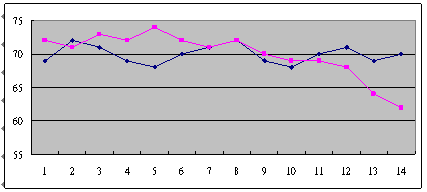 這是兩個(gè)呼叫中心從早上8點(diǎn)開(kāi)始,一直到晚上6點(diǎn),每隔半個(gè)小時(shí)的服務(wù)水平?梢院芮宄目吹剑{(lán)色這條線,它服務(wù)水平在91到48這中間震蕩,平均服務(wù)水平是73左右,粉紅色這條線,雖然平均服務(wù)水平也是在73左右,但震蕩幅度卻小了很多,服務(wù)水平只在81到68這中間震蕩。