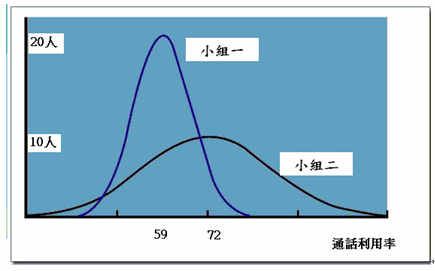 這是兩個(gè)班組的偏差圖,有些移動(dòng)公司開(kāi)始使用這樣的偏差圖來(lái)進(jìn)行管理,這張圖把小組每個(gè)座席員的通話利用率都打了上去,做成一張頻次表,看的方法很容易,橫軸是通話利用率,縱軸是座席員數(shù)目。