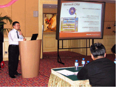 微軟公司負(fù)責(zé)天津地區(qū)的夏玉玲小姐在簡(jiǎn)短的開(kāi)幕式后首先發(fā)表演講,介紹了微軟為商業(yè)應(yīng)用開(kāi)發(fā)的各種商務(wù)解決方案(MBS)。其后通用咨詢公司總經(jīng)理鄭明先生上臺(tái)演說(shuō),其演講主題將營(yíng)銷管理理論體系與微軟CRM密切結(jié)合,博得了與會(huì)者贊同的掌聲。