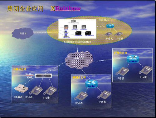。。首先我們需要這4個(gè)地點(diǎn)都有自己的網(wǎng)絡(luò)接入,最好是寬帶。以北京總部為列,如果將Xrainbow系統(tǒng)放在北京總部,這就需要北京總部這邊有一個(gè)固定IP地址的網(wǎng)絡(luò)接入,其他分公司不需要固定ip地址,只要可以上網(wǎng)就可以登錄到北京總部的Xrainbow系統(tǒng)。這樣企業(yè)與分支機(jī)構(gòu)之間就實(shí)現(xiàn)了零話費(fèi),同時(shí)還可以提供傳真業(yè)務(wù)。另外終端設(shè)備可以隨意移動(dòng),只要可以上網(wǎng)的地方就可以接入我們的終端設(shè)備,免去了因公司的發(fā)展或者搬動(dòng)而要去申請(qǐng)初裝大量電話的煩惱。