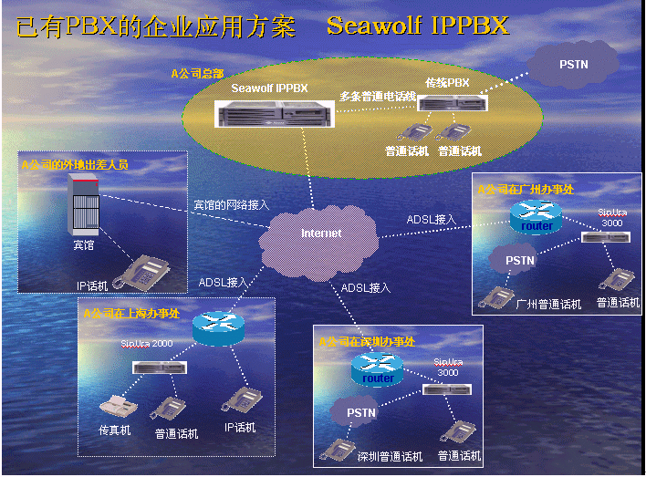 北京海狼網(wǎng)絡(luò)通信有限公司推出的Seawolf IPPBX解決方案切實從集團企業(yè)的利益出發(fā),為客戶成功地降低了通訊成本。Seawolf IPPBX是一款功能強大的小型語音交換平臺設(shè)備。它將傳統(tǒng)的交換機技術(shù)與VOIP的先進技術(shù)完美融合,提出了VOIP的企業(yè)級解決方案。此方案能大大縮減各大、中、小型企事業(yè)單位的通信費用,同時增加員工的工作效率。隨著產(chǎn)品的不斷普及,Seawolf IPPBX將成為企業(yè)辦公不可缺少的一部分。此方案適合于已經(jīng)有PBX的公司,由于先期已經(jīng)投入了PBX設(shè)備,費用昂貴,所以不會輕易被替換。在外地有多家分公司,使用傳統(tǒng)電話通訊費用很高,希望能降低成本。并希望在分公司所在城市可以通過當(dāng)?shù)氐腜STN落地,節(jié)省長途費用。依照客戶的需求,我們制定了以下方案:海狼科技公司供稿 CTI論壇編輯