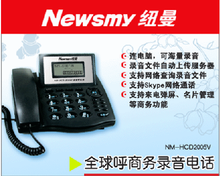 近日,北京紐曼公司(www.newman-cti.com)推出的一款具備強(qiáng)大商務(wù)管理功能的NM-HCD2005V全球呼商務(wù)錄音電話,以其強(qiáng)大的錄音和獨(dú)特的客戶(hù)信息管理功能獲得了消費(fèi)者的青睞。據(jù)了解,這款商務(wù)錄音電話除了具備傳統(tǒng)錄音電話的錄音和留言的功能之外,還支持網(wǎng)絡(luò)查詢(xún)、來(lái)電彈屏顯示、名片管理、撥打網(wǎng)絡(luò)電話、集中錄音管理,可將錄音上傳到企業(yè)服務(wù)器等強(qiáng)大實(shí)用的商務(wù)功能。