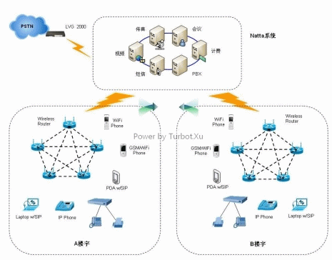 如果當(dāng)整個(gè)樓宇被WiFi網(wǎng)絡(luò)覆蓋,用戶可通過WiFi Phone或支持WiFi功能的PDA手機(jī)注冊(cè)到Netta交換系統(tǒng),如使用有線網(wǎng)絡(luò),用戶可通過Gateway