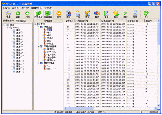 主要是對錄音進行管理,分為錄音查詢和錄音操作兩大部分。錄音查詢除了提供常規(guī)的按條件組合查詢外,還提供了人性化的常用查詢,系統(tǒng)已經(jīng)內(nèi)置了很多常用查詢,例如:當(dāng)日查詢,您只要直接選擇當(dāng)日查詢,就可以馬上開始查詢當(dāng)日的所有錄音,減少您每次輸入查詢條件的工作量,并且還可以靈活的自定義常用查詢,充分滿足您的查詢要求。錄音操作提供了方便快捷的操作方式。批量數(shù)據(jù)的處理能力可以讓用戶以最快的速度從煩瑣的工作中解脫出來。詳細的記錄信息可以滿足所有用戶的要求,特定信息的加入可以滿足特殊行業(yè)的使用,如呼叫中心行業(yè)、服務(wù)臺、傳呼臺等。