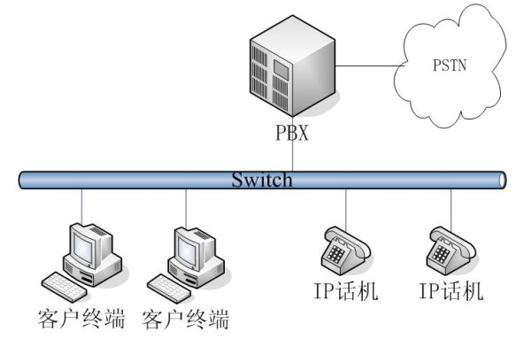 - 簡(jiǎn)單網(wǎng)絡(luò)結(jié)構(gòu):一般適用于小型企業(yè)或企業(yè)內(nèi)某個(gè)部門的網(wǎng)絡(luò)結(jié)構(gòu)。內(nèi)部通訊在一個(gè)網(wǎng)段內(nèi),外部通訊通過一臺(tái)PBX交換。