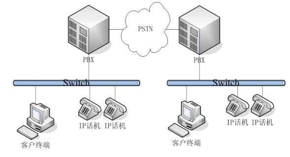 - 普通網(wǎng)絡(luò)結(jié)構(gòu):適用用于中型企業(yè)。在不同地域有公司分部,各分部之間通訊需要通過PSTN,每個(gè)分部都有自己的PBX。相對(duì)于每個(gè)分部而言,采用的是簡(jiǎn)單網(wǎng)絡(luò)結(jié)構(gòu)。