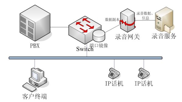 NETLOG VOIP語(yǔ)音記錄系統(tǒng)采用端口鏡像技術(shù),在要錄音網(wǎng)絡(luò)的PBX上將所有的數(shù)據(jù)包生成一個(gè)副本,在不影響主線傳輸?shù)幕A(chǔ)上,把副本傳送到錄音網(wǎng)關(guān)RG(Record