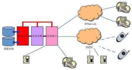 其中,業(yè)務(wù)接口部分為呼叫中心提供面向服務(wù)服務(wù)對象(客戶)的連接和面向服務(wù)者(座席)的連接接口,業(yè)務(wù)交換部分負責在請求服務(wù)的對象與提供服務(wù)提供者之間建立連接,業(yè)務(wù)處理部分負責對這些連接及服務(wù)內(nèi)容進行管理和維護,數(shù)據(jù)存儲部分則為所有服務(wù)提供必要的數(shù)據(jù)資源和數(shù)據(jù)備份。