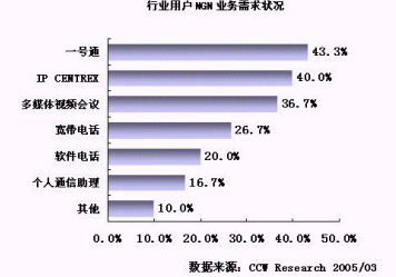 NGN 成為電信運(yùn)營(yíng)商滿(mǎn)足用戶(hù)需求的有力武器。不同的行業(yè)用戶(hù)對(duì)基于 NGN 推出的電信業(yè)務(wù)表現(xiàn)出了較大的需求差異,例如: IT通信、物流和服務(wù)業(yè)對(duì) IP CENTREX 、多媒體視頻會(huì)議和寬帶電話(huà)等業(yè)務(wù)比較感興趣,而政府用戶(hù)對(duì)一號(hào)通等業(yè)務(wù)比較感興趣。不同行業(yè)對(duì)業(yè)務(wù)需求具有差異性,這就要求運(yùn)營(yíng)商基于 NGN 平臺(tái)開(kāi)發(fā)的業(yè)務(wù)要有更大的靈活性,要有突出用戶(hù)通信需求的整體解決方案,要能滿(mǎn)足用戶(hù)的個(gè)性化需求。